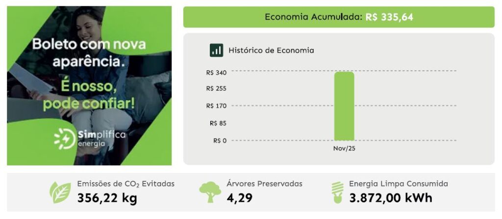 A economia é gerada a partir dos créditos de energia produzidos pelas usinas solares e hídricas da Simplifica. Os créditos são aplicados sobre o consumo da unidade, proporcionando uma redução na fatura de energia.